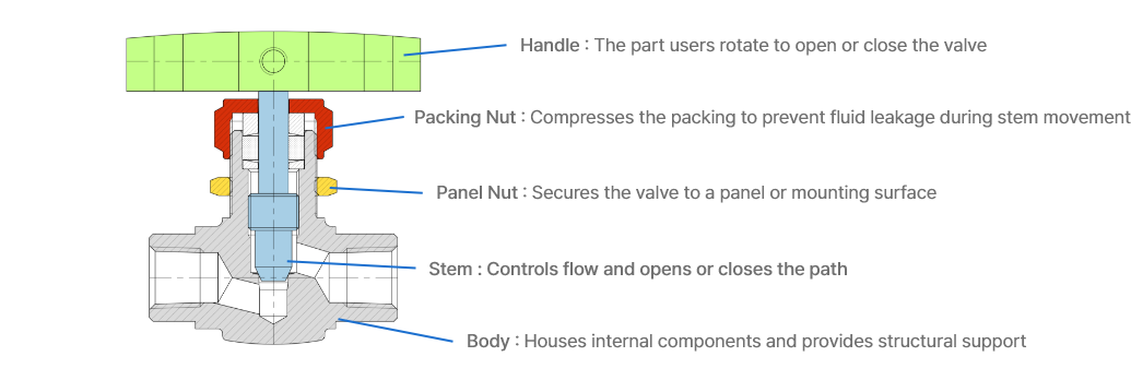 Rotating the stem moves the needle gradually into or out of the seat, adjusting the flow path.