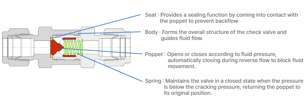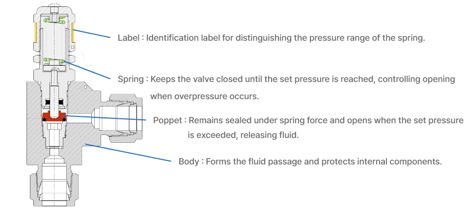 The internal structure is consist of Body, Poppet, Spring, and Seat.